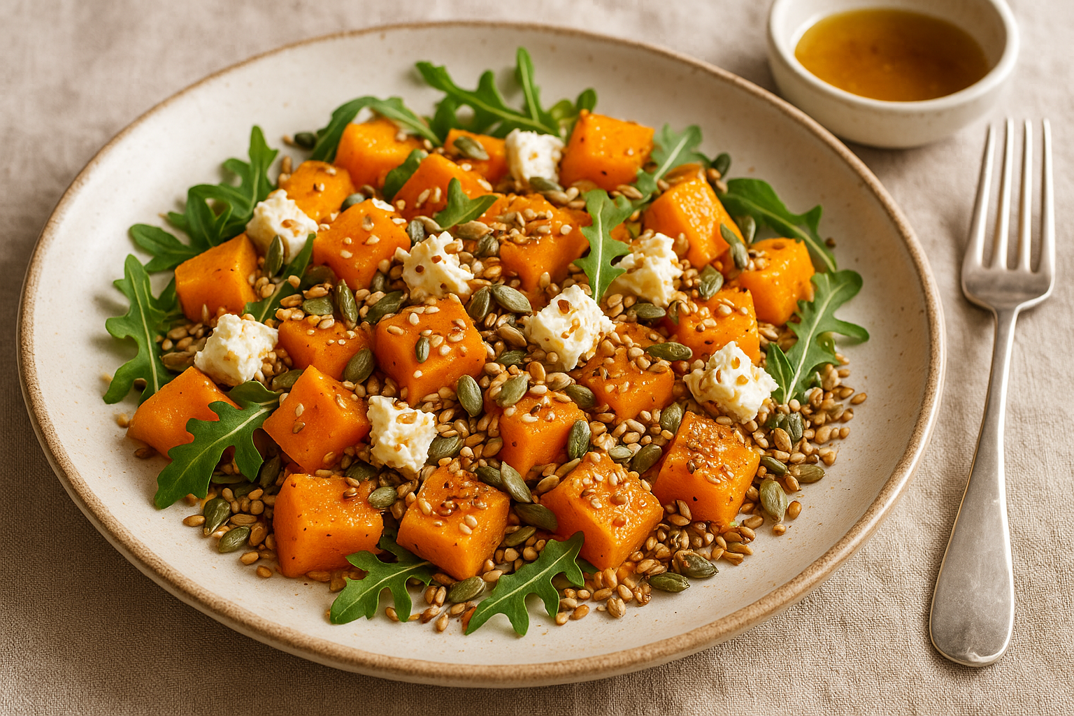 Une recette généreuse : salade tiède de butternut, feta et graines croquantes